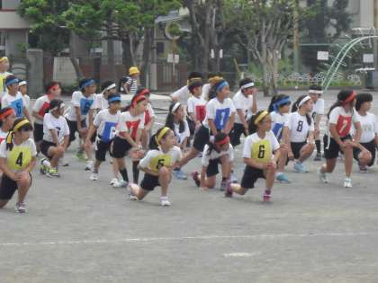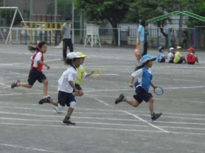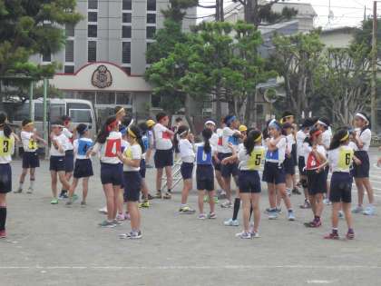 低学年の児童が力いっぱい走っています。高学年はバトンの渡し方の一斉練習でしょうか。低学年のレースがスタートすると少しそちらが気になったようです。