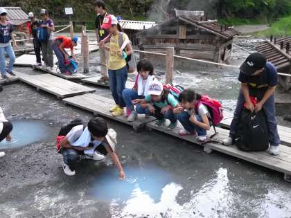 林間学校2日目。10:15湯ノ湖到着。雲行きが少し怪しくなってきました。湖と源泉の写真です。
