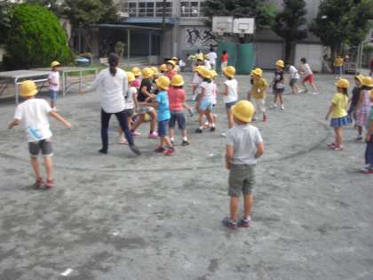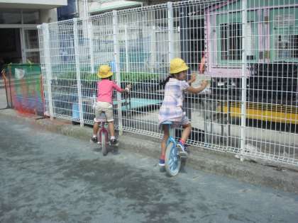 1年生がたくさんで元気に遊んでいました。その近くで高学年の子供が飼育小屋のうさぎのお世話をしていました。1年生は一輪車も上手になってきました。