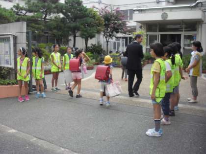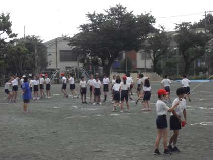 あいさつキャンペーンをやっています。1年生のお家の方が登校時に一緒に来校し、朝顔をもってきてくれました。校庭では体育朝会に向けて6年生が大縄をがんばっていました。