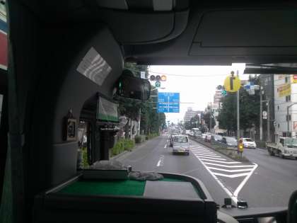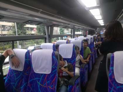 移動教室1日目。8:35バスの中の様子。ガイドさんにクイズをだしてもらっています。もう少しで高速です。