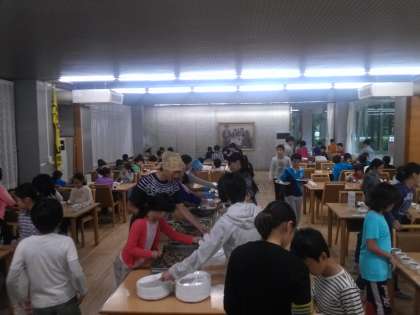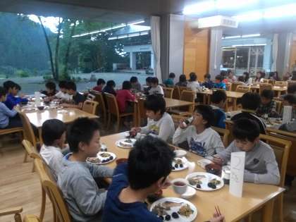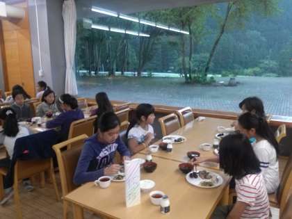 移動教室2日目。7:12食堂の様子です。みんなでおいしくいただきます!