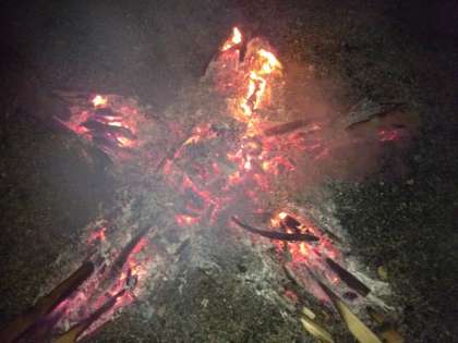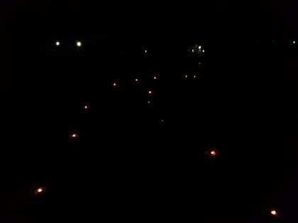 移動教室2日目。20:30キャンプファイア終わる。写真は帰路にならべられたアロマキャンドルとキャンプファイアの残り火です。