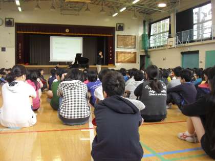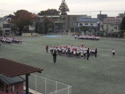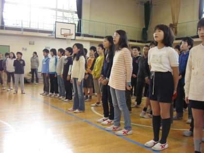 低学年は校庭でマラソンに、高学年は体育館で復興支援ソングの練習に取り組みました。