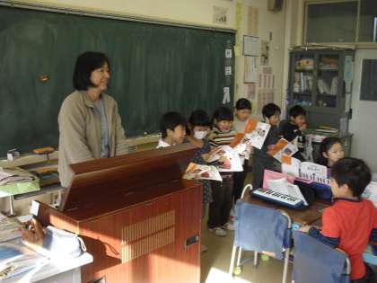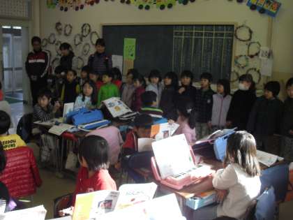深沢保育園のお友達が小学校に遊びに来てくれました。写真は一年生のクラスの見学をしているところとその時の一年生の様子です。