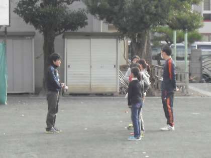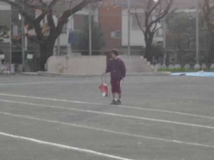 子ども駅伝に参加する子が集まっていました。マラソン週間ということで、先生がトラックの線をひいていました。