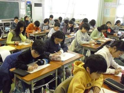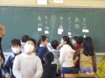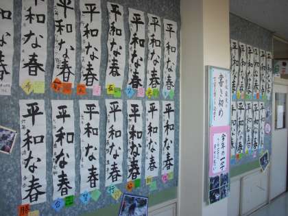 五年生が真剣に目標を立てていました。四年生は係決め。14日から書き初め展がはじまりますが、できあがった学級は貼りだし始めました。