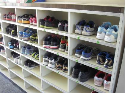 校庭で3年生が体育に取り組んでいました。ボールのゲームがもう少しで始まります。ルールほ守って楽しく取り組みます。もうひとつの写真は靴箱です。このクラスのようにかかとがそろえられるとよいのですが…。がんばります。