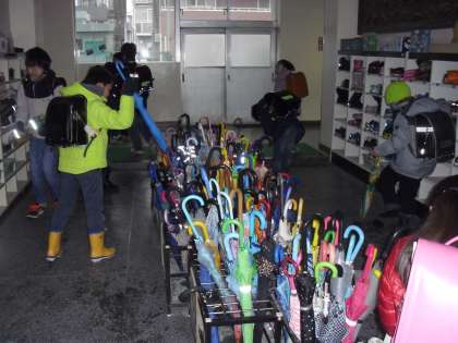 天気情報では、雪が降ってくることになっていますが、今はまだ雨ということで、寒さの中傘をさしての登校となりました。雪を期待していた子も多く、ちょっと寂しそうでした。昇降口のかさはしっかり丸めて入れることができています。