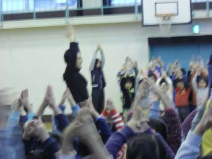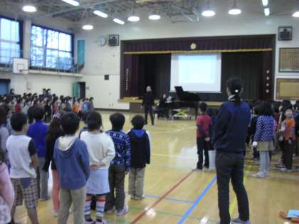 高体低音朝会の日でしたが、雨のため高体朝会の方は中止となりました。写真は、低音朝会の様子です。「生きてこそ」という歌を1〜3年生が気持ちを込めて大きな声で歌いました。
