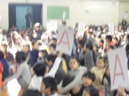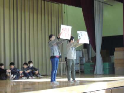 集会委員会の子どもたちが先生の特徴をつかんだ寸劇をして、何先生かをあてるというクイズでした。楽しく盛り上がりました。集会委員会として企画する本年度最後の集会となりました。朝早くから練習することもありました。お疲れ様でした。