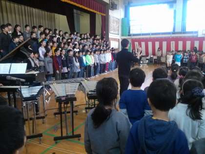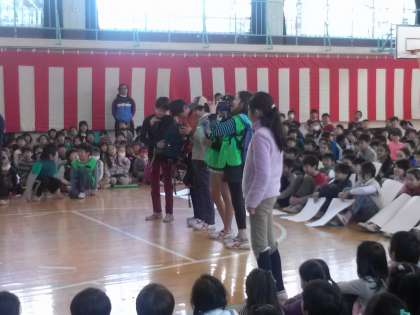 体育館で六年生を送る会がありました。各学年の出し物や全員合唱などがありました。