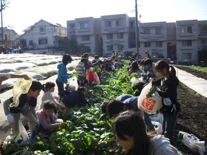 さて、スーパーの袋にいっぱいの(しかも2袋!)小松菜を持って帰った子どもたち、今夜の食卓には小松菜を使ったお料理がきっとならんでいることでしょう。 今日持ち帰った小松菜は無農薬だそうです。お世話をしてくださった教育委員会の方が「真似はしないでね。」とおっしゃりながら、その場で食べて見せてくださいました。小松菜は生でも食べられるということです。おいしい小松菜を沢山召し上がってください。