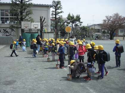 黄色い帽子の一年生がコースに分かれてならんでいます。気持ちのよい日ざしの中、お友達と一緒に帰ります。