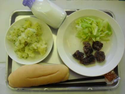 今日は昭和27年ごろの献立です。このころは初めて完全給食が実施されたころです。 今ではめずらしい鯨の肉が当時は豚肉よりも安価に買うことができたため給食によく登場しました。今日の給食に「鯨の竜田揚げ」が出ました。普段食べなれないものですが子どもたちはよく食べていました。完食でした。
