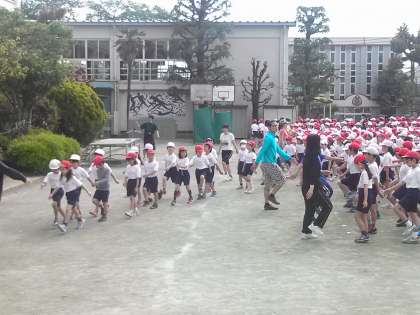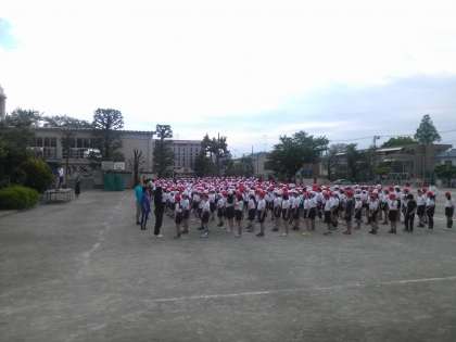 児童朝会で、運動会の服装や行進のことについて学びました。一年生も頑張っていました。