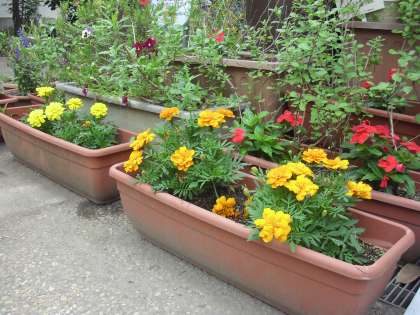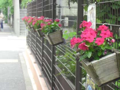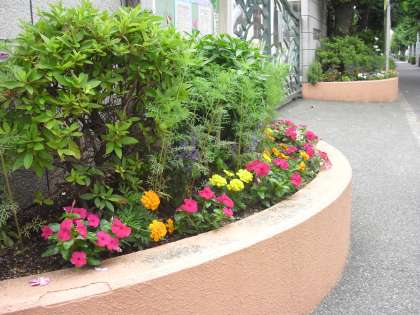 正門にきれいな花が勢ぞろい。子ども達を出迎えます。
