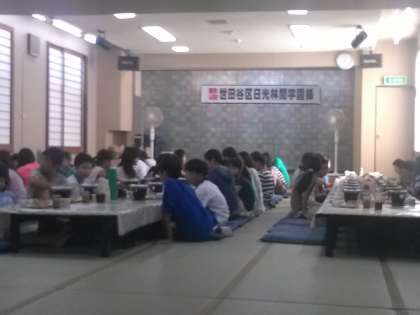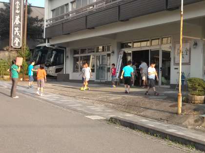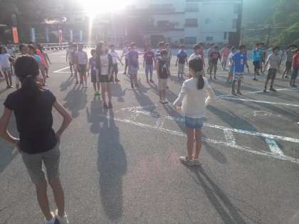 二日目。ラジオ体操に向かうこどもたちと宿での最後の朝食の様子です。みんな元気です。
