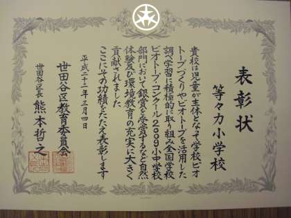本校の自然体験、環境教育に対して世田谷区から特別学校賞をいただきました。これからも環境教育のさらなる充実を図ってまいります。