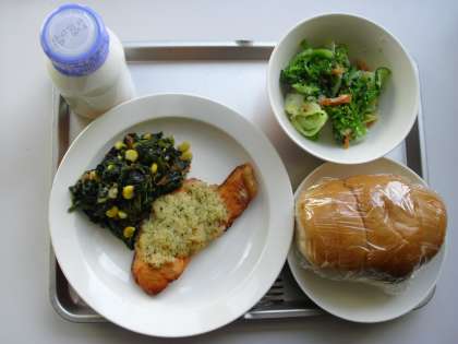 4年生が育て、収穫したブロッコリーとカリフラワーを給食でいただきました。右上のフレンチサラダに入っています。特別な味がしました。