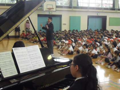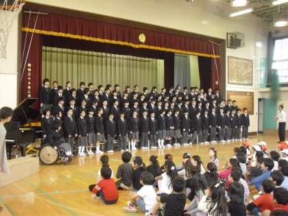 小中で形成させる、みしまの森学舎。その活動の一環で東深沢中の1年生が合唱を披露しに小学校にきてくれました。「大切なもの」など、心に響く歌声が体育館いっぱいにひろがりました。