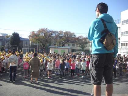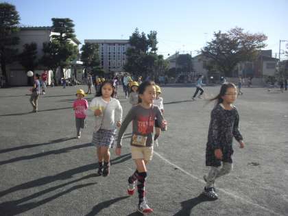 青空の下、全校朝会が行われました。校長先生からは、「よく聞くこと」「ふれあい月間のお話」。看護当番の先生からは「廊下を走らないなど約束を守ることは、いじめを許さないということにつながる。」というお話でした。みんな真剣に聞いていました。写真は、朝、朝会の前にマラソンを頑張っている子供たちの様子と看護当番の先生がお話をしている時の様子です。