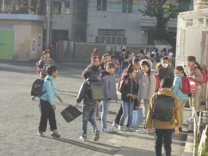 登校時間の8時5分にはたくさんの子がいました。今日も元気です。よい天気の中頑張ります。