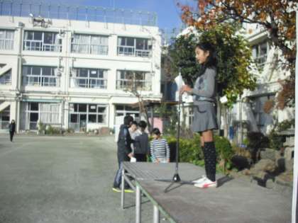 今日は、保健委員会の子どもたちがカゼについて発表をしてくれました。セキをすると「つば」などが周りの人にまで飛んでいくということでした。「手ておさえる」「マスクをする」など気を付けていきたいものです。また、六年生からは、「廊下にかけてあるものが落ちていたらどうしたらよいか」「ハンカチをもってくるといいこと」などについて説明がありました。六年生は今、学校をよりよくしていく活動に取り組んでいます。