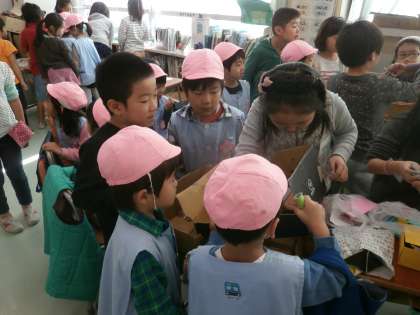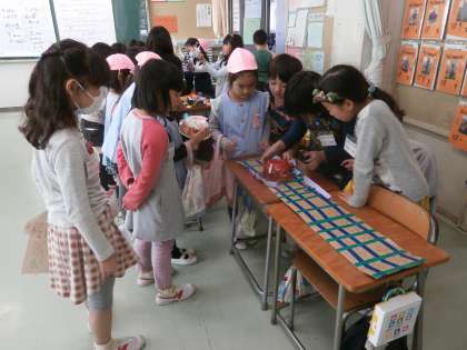 本日は、みしま幼稚園のみなさんをお招きして、秋祭りを行いました。2年生がたくさん話し合って考えつくったお店やさんで、おもてなしをしました。どうしたらみしま幼稚園のみんなが喜んでくれるか考えながらつくったお店やさんは、優しい工夫でいっぱいです。