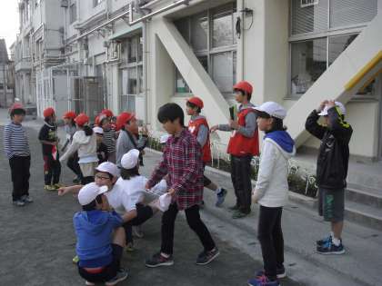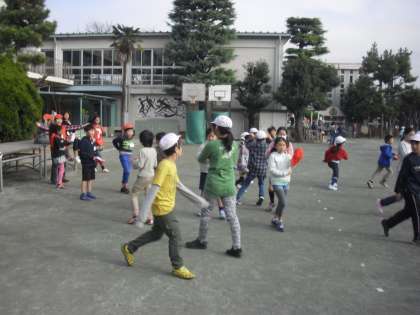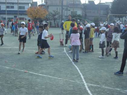 キッズ班(縦割り班)で遊びました。低学年の子を高学年がリードして楽しく遊びました。写真は、校庭の様子です。けいどろ、ドッジボールなど様々なことをして楽しんでいました。