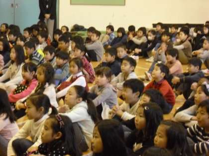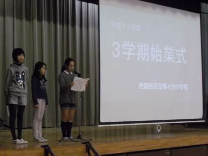 久しぶりの学校ということで、お友達との再会を喜ぶ姿が見られました。写真は、始業式の児童代表の子の発表の様子とそれを聞いている子供たちの様子です。