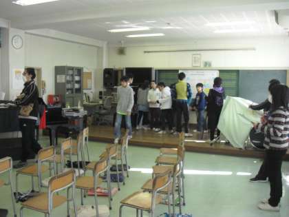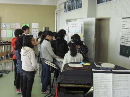 卒業式に向けて、「大切なもの」という歌の練習をしていました。どこを大きな声で歌うか。気持ちを込めるということはどういうことか等について、自分たちで考えながら授業が進みました。写真は、先生から歌い方について指導を受けているところとパート練習の様子です。