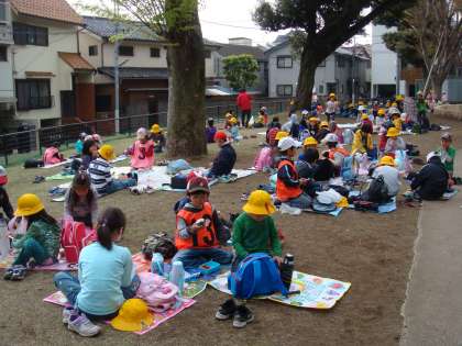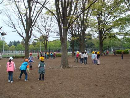 1年生といっしょに、駒沢公園に遠足に行きました。お天気が心配でしたが、グループごとに楽しく遊びました。おべんとうを食べている時にポツポツ雨が降ってきたので、早めに帰ってきました。