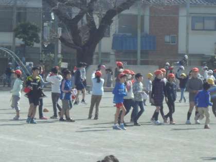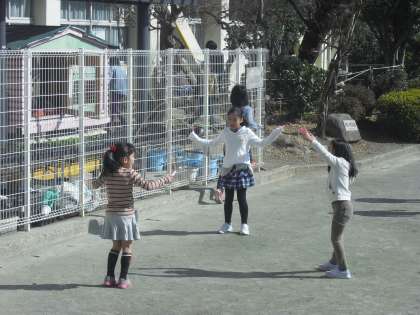 朝と比べるととても暖かくなりました。子どもたちも思い思いに元気に遊んでいます。縄跳びをがんばったり、お友達と遊んだり、中にはクラスで遊んでいる子たちもいました。