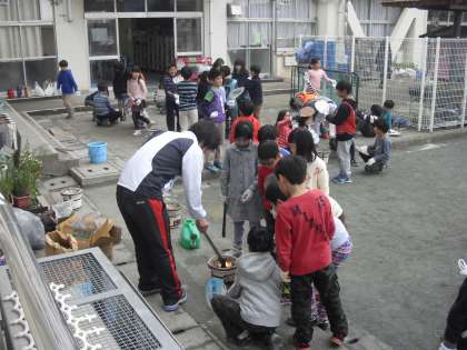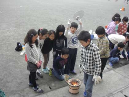 七輪でそれぞれがもってきたウインナーやソーセージを焼いて食べるという活動にとりくみました。なかなか火をコントロールするのは難しかったようです。