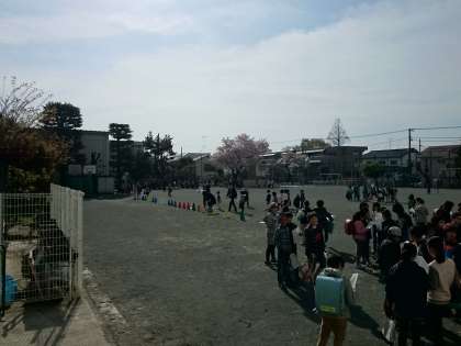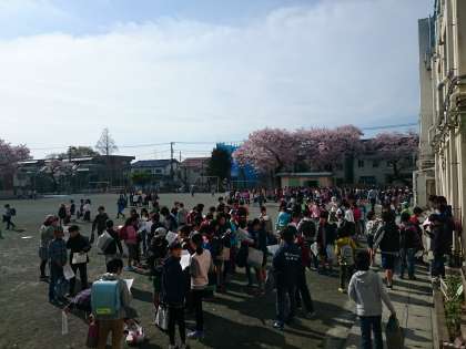 これから始業式が始まります。クラス替えがあったクラスは名簿を見ながらみんな喜んでいます。(4月6日)