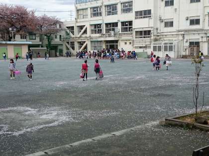 校庭に落ちている桜の花びらが風で舞い上がっていました。登校してきた子ども達が物珍しく近くによって見ていました。(4月8日)