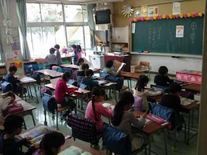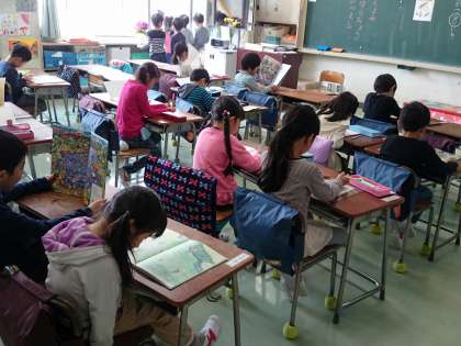 学校が始まったばかりなので、休み時間は教室で本を読んだり折り紙をしたりして過ごしています。(4月8日)