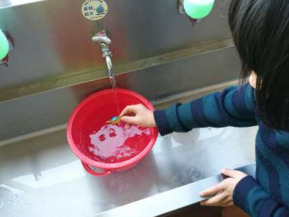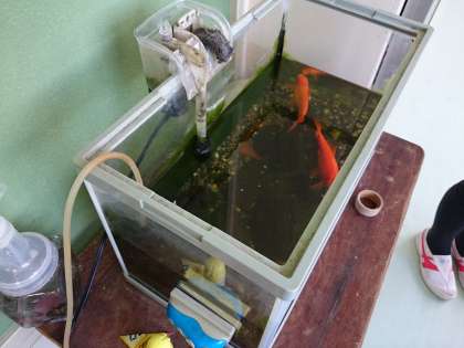 新しい学年に進級し、早速係活動を行っています。水飲み場では、生き物係が金魚の水を新しくするために水作りをしていました。(4月11日)