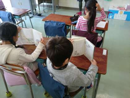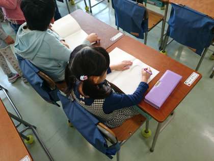 休み時間は、教室で自由帳に絵をかいたり本を読んだりしています。(4月12日)