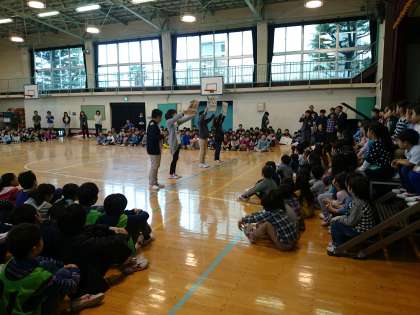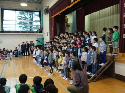 今日は、学校に関係のあるクイズをしたり全校児童で歌を歌ったりして等々力小学校の仲間入りをしました。(4月14日)