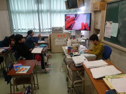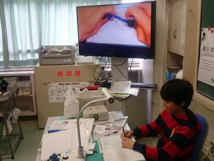 点対称な図形の性質を見つけた子どもが図形を見せながら説明していました。(4月14日)
