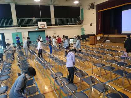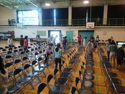 各学年の保護者会のために、体育館に椅子を並べています並べ方が速くなってきました。(4月15日)