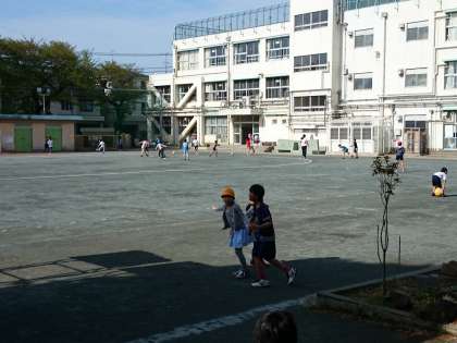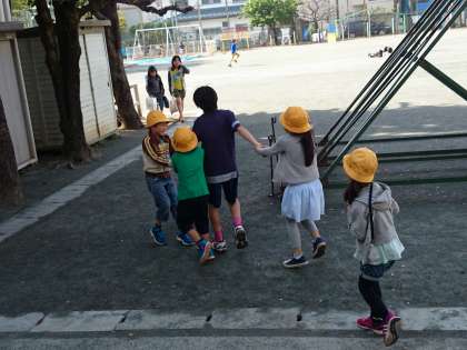 朝の準備ができた子ども達は、黄色い帽子をかぶって校庭に出てきました。1年生の中には、6年生と遊んでほしい子もいました。(4月18日)