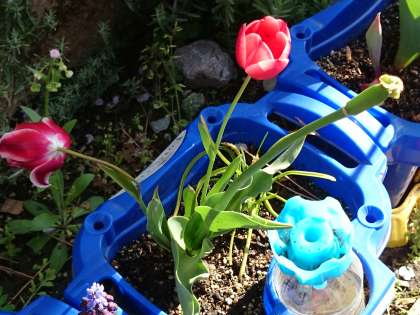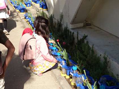 朝、一人一人が育てているチューリップに水をあげて元気に育っているか観察していました。(4月19日)