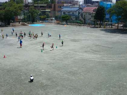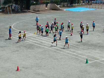 バトンの受け渡しとコーナーの走り方を工夫しながらリレーの学習をしました。(4月22日)