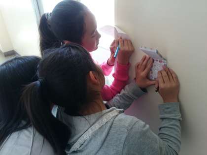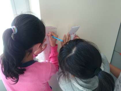 次回の児童集会では、新しく来た先生クイズをします。今日は、先生クイズ用のヒントを先生達に聞いていました。(4月26日)