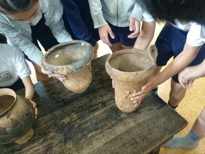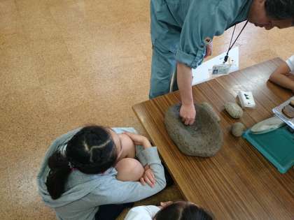 世田谷区で出土した土器や石器をじっさいにさわりました。世田谷区の方が詳しく説明してくださいました。(4月27日)