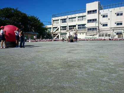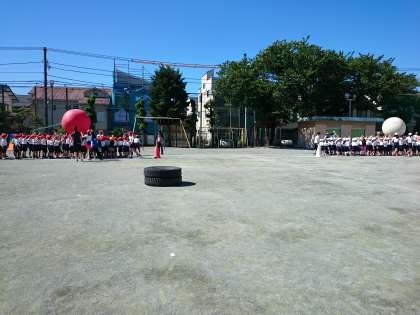 体育朝会で大玉おくりの練習をしました。(5時12日)