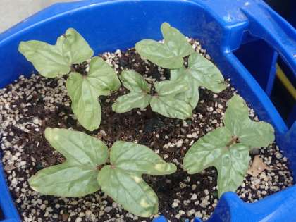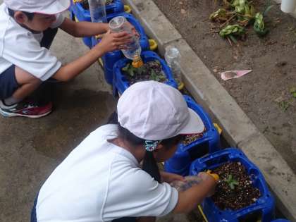 昼休み、自分が育てているアサガオに水やりをしながら成長を観察していました。(5月20日)